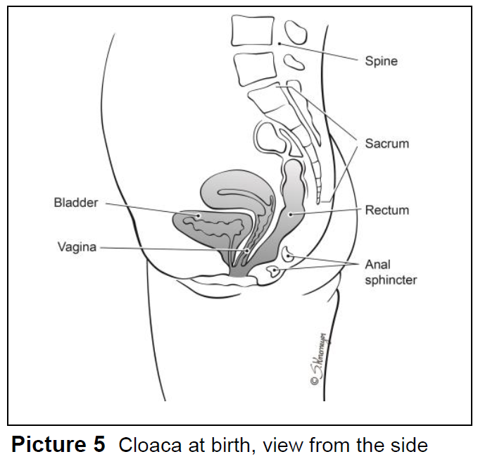 - Cloaque – (klo AY ka) l’intestin inférieur (rectum), l’urètre et le vagin se réunissent pour former une seule ouverture (Photos 4).