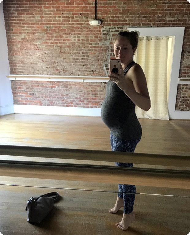 Dormir: Além de acordar um monte (pareço estar bem acordado por volta das 3 da manhã muitas noites e pode levar uma hora para adormecer) e sendo uma dura provação tentar mudar para o outro lado durante a noite (tenho um bilhão de almofadas para mover, mais sentar-me é super constrangedor/duro neste momento), tenho dormido relativamente bem nas últimas 2 semanas, em grande parte graças ao facto de não termos tido cães a acordar-nos muito cedo. (Eles têm estado fora numa prancha de 2 semanas e a treinar – veja a minha actualização de gravidez de 32 semanas para mais informações.)